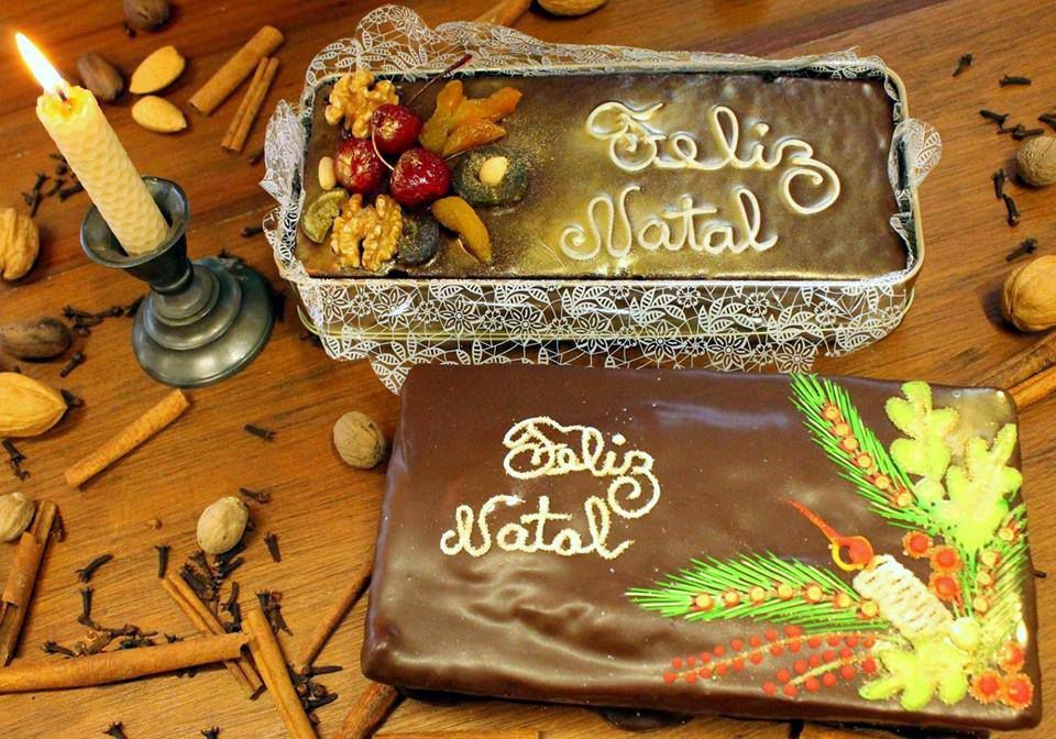 Bolo de mel :trigo , margarina , leite, açucar , ovos , mel , uvas passas , nozes , castanha do Pará , condimentos , chocolate .